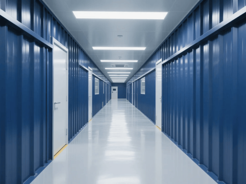 車間采用模塊化潔凈室結構,墻體采用50mm厚深藍抗菌彩鋼板,接縫處采用圓弧處理工藝。自動化沖壓線與激光焊接工作站呈U型交替布局,工作站間設置深灰不銹鋼傳遞窗,確保物料流轉潔凈度。吊頂系統配置FFU高效過濾單元,維持≥20次/h換氣次數,氣流組織采用頂送側回模式。