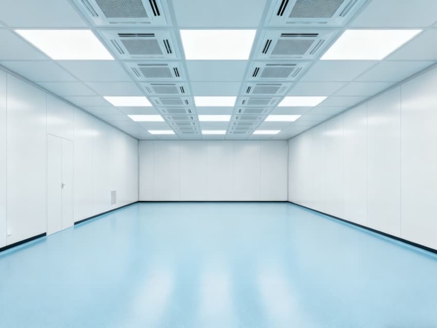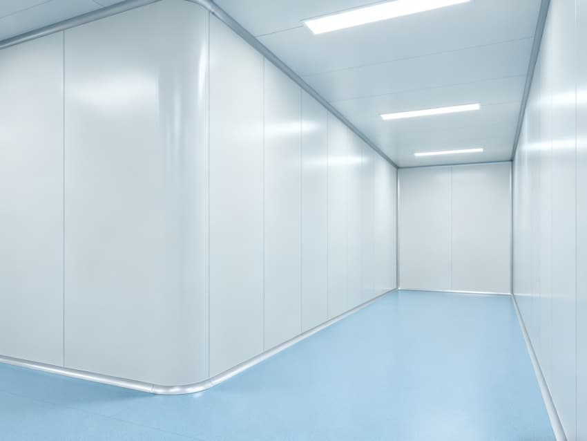 內部按功能劃分為六大潔凈區域:核心潔凈生產區(淺藍色防滑防霉地面)預留開闊空間,滿足發酵罐、純化設備等后期安裝;頂部潔凈送風區通過規整風閥系統,實現萬級潔凈度均勻送風;墻面過渡區采用圓弧轉角設計,避免粉塵堆積;密閉觀察區設雙層鋼化觀察窗,兼顧生產監控與無菌隔離;縱向設備預留區保留8米凈高,適配大型凍干設備動線;輔助緩沖區銜接車間入口,搭配風淋系統,實現人員/物料潔凈過渡。整體空曠布局既保障潔凈操作空間,又滿足皖北生物制藥企業靈活擴產需求,為本地藥企提供合規、高效的生產載體。