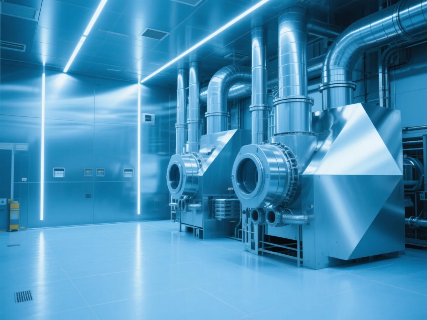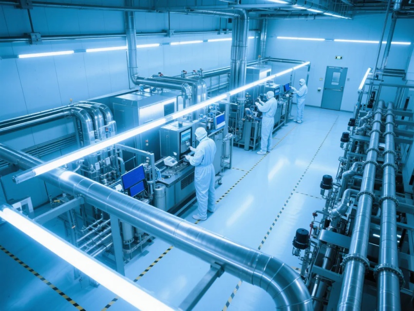 本百級(jí)車(chē)間采用"超凈工業(yè)未來(lái)主義"風(fēng)格,符合ISO14644-1Class3標(biāo)準(zhǔn)(≥0.1μm顆粒≤1,000/m³)。設(shè)計(jì)核心突破: