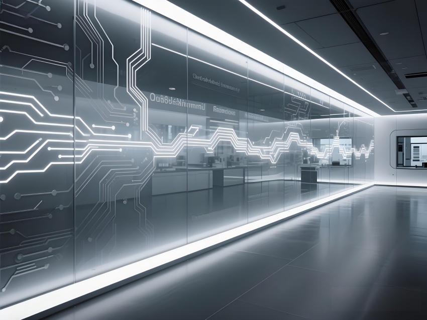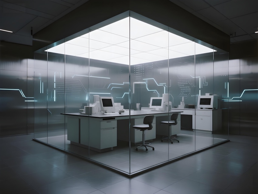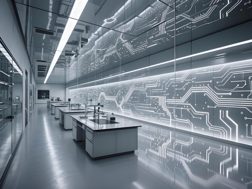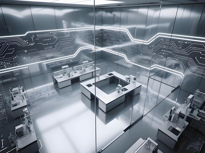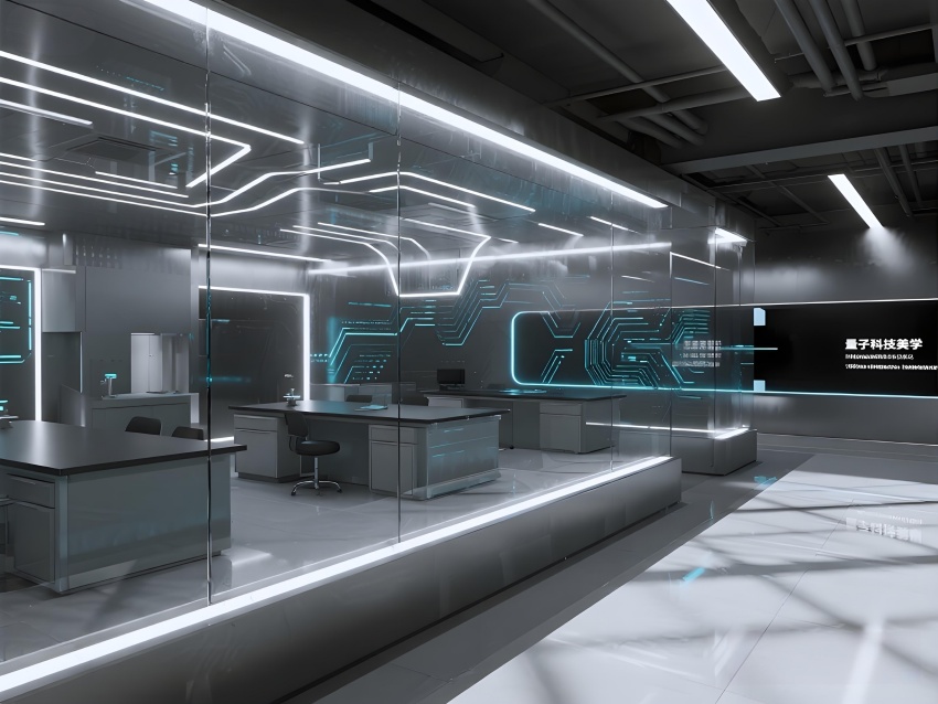 本實(shí)驗(yàn)室采用"量子科技美學(xué)"設(shè)計,將納米尺度的精密感轉(zhuǎn)化為空間敘事。主實(shí)驗(yàn)區(qū)以鏡面銀與深空灰為基調(diào),半透明防輻射玻璃墻體內(nèi)嵌電路板紋理光帶,象征微觀世界的電子軌跡。百級潔凈區(qū)的金色氣流箭頭與千級區(qū)的藍(lán)色光暈形成能級躍遷般的視覺分級,CVD設(shè)備艙的蜂窩狀散熱孔與懸浮式控制面板構(gòu)成未來工廠意象。地面導(dǎo)光纖維模擬分子結(jié)構(gòu)網(wǎng)絡(luò),天花板動態(tài)粒子監(jiān)測屏以數(shù)據(jù)流形式投射納米顆粒分布。通過冷調(diào)LED與設(shè)備熒光的層次照明,在滿足EMI屏蔽與化學(xué)防護(hù)需求的同時,創(chuàng)造出如同操作量子領(lǐng)域的沉浸式科研環(huán)境,透明氣閘門上的全息警示標(biāo)志進(jìn)一步強(qiáng)化尖端材料研究的科技儀式感。