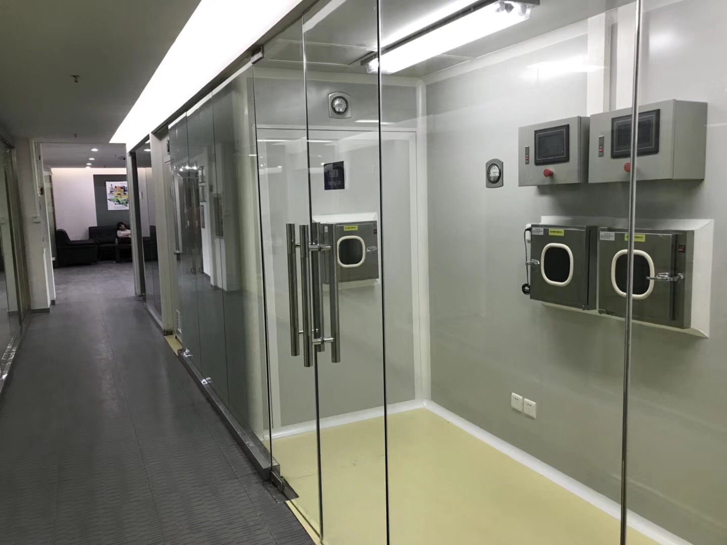 2)間隔:用雙面彩鋼保溫板圍護及間隔,圍護面到天花頂;潔凈走廊及車間間隔處做通透鋁合金半玻璃窗,窗臺高900mm,玻璃厚8mm,高1200mm,玻璃窗高平門高度(2100mm);鋁合金窗料用特制凈化材料,45?度斜邊,與地面及天花交角做元弧及陰角接口,符合規范及衛生消毒要求。