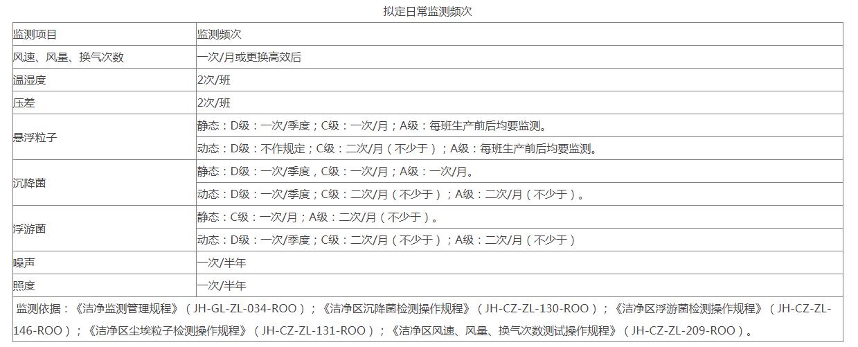 監(jiān)測(cè)依據(jù):《潔凈監(jiān)測(cè)管理規(guī)程》(JH-GL-ZL-034-ROO);《潔凈區(qū)沉降菌檢測(cè)操作規(guī)程》(JH-CZ-ZL-130-ROO);《潔凈區(qū)浮游菌檢測(cè)操作規(guī)程》(JH-CZ-ZL-146-ROO);《潔凈區(qū)塵埃粒子檢測(cè)操作規(guī)程》(JH-CZ-ZL-131-ROO);《潔凈區(qū)風(fēng)速、風(fēng)量、換氣次數(shù)測(cè)試操作規(guī)程》(JH-CZ-ZL-209-ROO)。