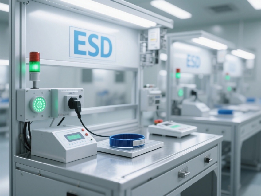 核心區(qū)域可見百級潔凈度的光刻車間,頂部密布FFU風機過濾單元,通過垂直層流控制微粒濃度(≤0.3μm顆粒每立方米<100個)。操作臺采用防靜電材質(zhì),配備離子風扇消除靜電干擾。?