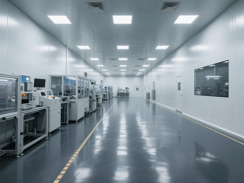 本工程嚴格遵循ISO14644-1Class6標準,專為高精度激光器件鍍膜工藝打造專業潔凈生產環境。整體采用啞白彩鋼板墻體與深灰防靜電環氧地坪的極簡工業配色,營造精準、穩定的光學器件生產空間。
