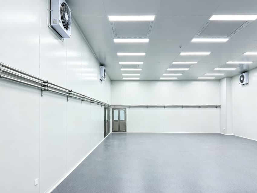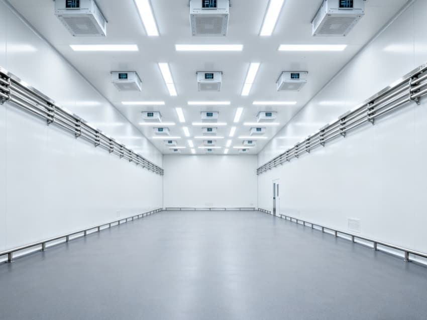 內部6個生產車間均為無設備空曠布局,按百級潔凈標準建設:地面鋪設防靜電環氧自流平,墻面采用無顆粒潔凈彩鋼板,陰陽角做R30圓弧處理杜絕積塵;柱網間距設為9米,預留光刻機、晶圓檢測設備等重型設備安裝點位;頂部整合恒溫恒濕系統、高效空氣過濾器及防頻閃LED照明,所有管線暗藏于吊頂內,最大化釋放空間高度,為芯片晶圓制造、封裝測試等核心環節提供超潔凈、高穩定的專屬生產環境。