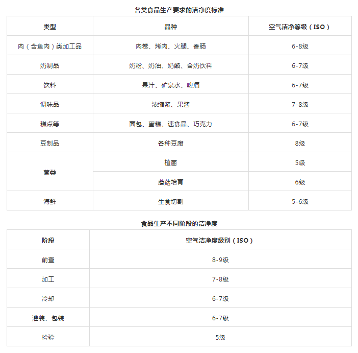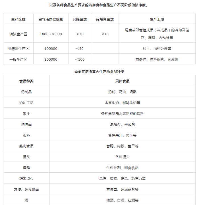 3、清潔作業(yè)區(qū)(潔凈室):指衛(wèi)生環(huán)境要求最高,人員、環(huán)境要求較高,必須經(jīng)過消毒和更衣才可以進(jìn)入,如:原料、成品裸露的處理區(qū)域,食食品的冷加工間、即食食品的冷卻間、待包裝即食食品的儲(chǔ)存間、即食食品的內(nèi)包裝間等。食品廠不同生產(chǎn)區(qū)域和空氣潔凈度等級(jí)