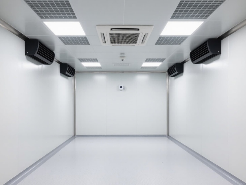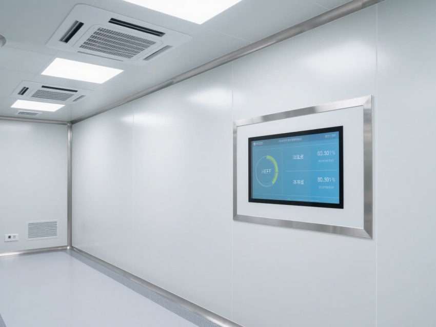 車間以白色抗菌彩鋼板為主體建材,搭配淺灰防靜電地坪,墻面與地面的圓弧過渡設計消除衛生死角,便于徹底清潔消毒。頂部嵌入式高效送風口形成垂直層流,配合側下回風系統,實現每小時15-25次的空氣置換,持續維持潔凈正壓。?