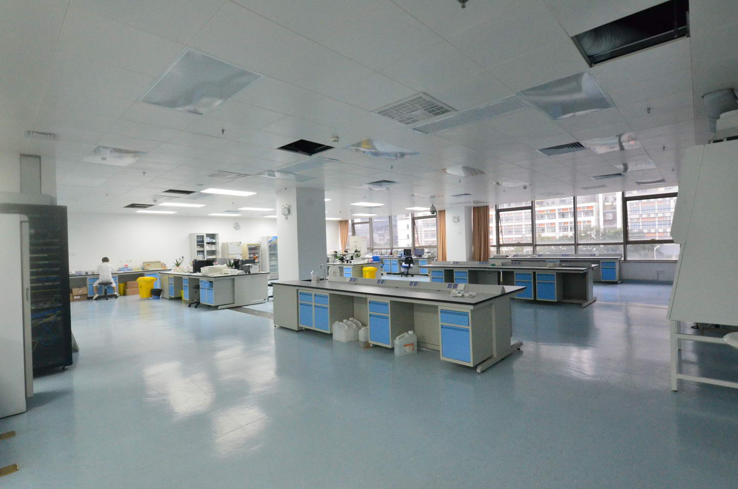 2、實驗臺面材質主要由實芯理化板、環氧樹脂板和千思板,因檢驗科實驗室使用的高溫設備不多,推薦使用實芯理化板臺面和千思板臺面。